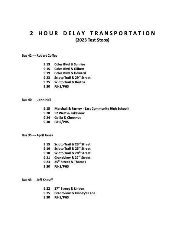 Here are the bus stops for the bus students not testing on Tuesdays and Thursdays.